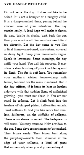 Do not seize the day. It does not like to be seized. It is not a bouquet or a naughty child. It is a damp-mouthed thing, pacing behind the chicken wire of your intentions. The day startles easily. A loud hope will make it flatten its ears, bristle its clocks, bark back the sun from your windowsill. You must not reach for it too abruptly. Let the day come to you like a feral thing—rain-boned, mistrusting, covered in dewy light. Keep your movements vague. Speak in lowercase. Some mornings, the day sniffs your hand. You call this progress. It may allow a slow brushing of your knuckles against its flank. The fur is soft here. You remember your mother’s kitchen towel—damp with lemon, too kind for the mess it endured. But if the day stiffens, if it bares its heat or lurches sideways with that sudden flame of unfinished grieving—you must not chase it. You are not owed its softness. Let it slink back into the treeline of chipped plates, half-written emails. Trust softness to find you like relics find ruin: late, deliberate, on the cliffside of collapse. There is no shame in retreat. The bedspread is still warm. You may return to it like a widow to the sea. Some days are not meant to be touched. They bruise easily. They bloom best along the periphery—watch them shimmer at the edge of your stillness, a kind of grace that arrives only when you stop demanding it.